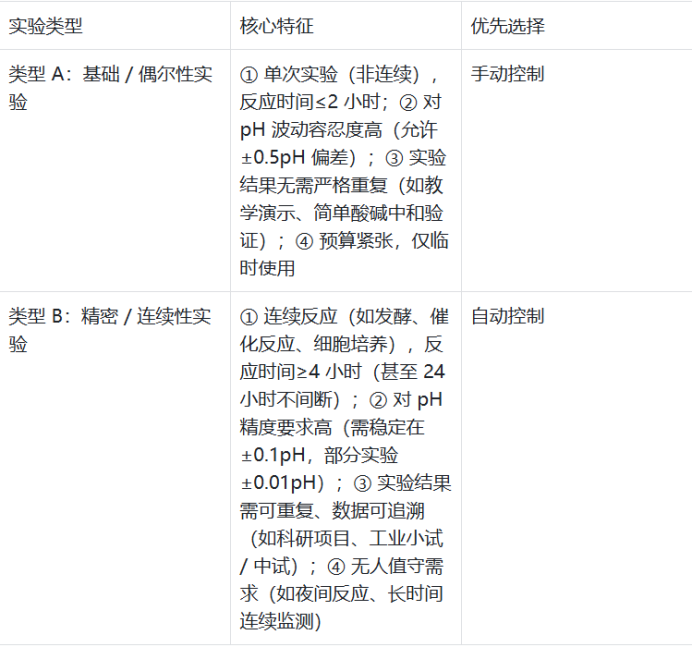 在實(shí)驗(yàn)室場(chǎng)景中,自動(dòng)控制是 “精準(zhǔn)、高效、可靠” 的首選,尤其適合科研、工業(yè)小試 / 中試等需要嚴(yán)格控制條件的實(shí)驗(yàn);手動(dòng)控制僅適合基礎(chǔ)、低頻、低精度的臨時(shí)場(chǎng)景。
