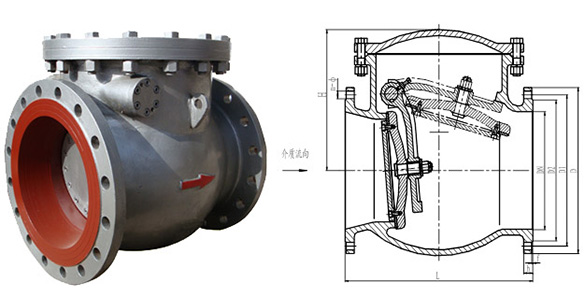 閥瓣在閥體內(nèi)腔處于自然下垂?fàn)顟B(tài),當(dāng)開泵正常運(yùn)行時,管路內(nèi)的壓力將閥瓣推動沿閥桿軸線轉(zhuǎn)動而開啟,介質(zhì)通過;停泵時,閥瓣以自身重力和介質(zhì)回流的壓力而自動關(guān)閉實(shí)現(xiàn)止回。